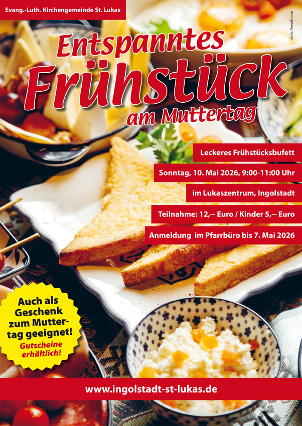 Haben Sie Lust auf ein leckeres Frühstück am Sonntagvormittag? Am 10. Mai 2026 besteht von 9:00 – 11:00 Uhr im Lukaszentrum Gelegenheit dazu. Weil wir am Tag zuvor Konfirmation feiern und deshalb an dem Sonntag mal keinen Gottesdienst haben, laden wir gerne zu diesem besonderen Frühstücksangebot ein. Es gibt ein reichhaltiges Frühstücksbufett bei dem jeder und jede sicher etwas findet. Erwachsene zahlen pro Person 12,-- Euro; Kinder nur 5,-- Euro. Für dieses Angebot sind bei uns in St. Lukas auch Gutscheine erhältlich. Es eignet sich nämlich auch gut als Geschenk zum Muttertag. Haben wir Interesse geweckt? Dann melden Sie sich gerne bis spätestens 7. Mai 2026 im Pfarrbüro (0841/920512) an.