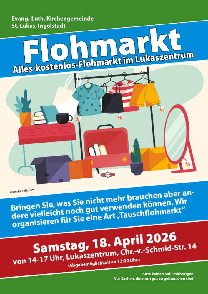 Am 18. April 2026 von 14-17 Uhr wird in St. Lukas, Christoph-von-Schmid-Str. 14, Ingolstadt verschenkt, was das Herz begehrt – ohne Geld, ohne Tausch, einfach so! Sie haben gut erhaltene Kleidung / Bücher / Spielsachen / Gebrauchsgegenstände, die Sie nicht mehr benötigen? Bringen Sie sie gerne ab 13 Uhr vorbei! Wir stellen Kleiderständer, Ablageflächen und Personal zur Verfügung. Sie wollen stöbern? Kommen Sie gerne vorbei und nehmen Sie mit, was Ihnen gefällt – kostenlos und ohne Verpflichtung etwas mitzubringen. Außerdem werden Sie die Möglichkeit haben eine Tasse Kaffee zu trinken und ein Stück Kuchen zu essen. Kommen Sie zahlreich, wir freuen uns auf Sie!